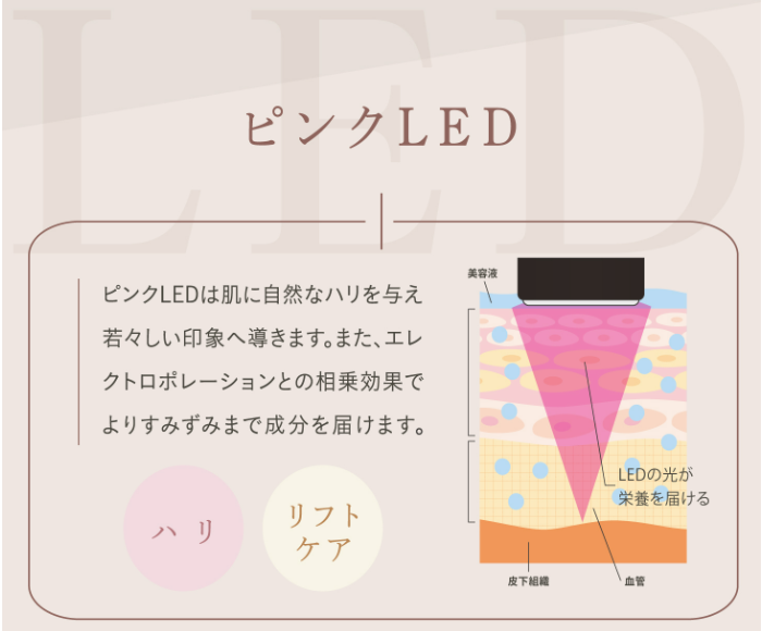 ピンクLEDが搭載されており、コラーゲンの産生をサポート。