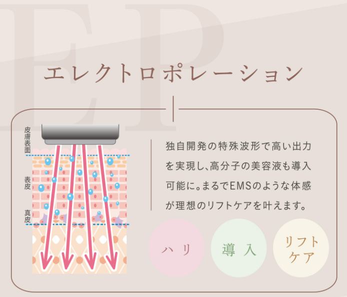 電気穿孔法という電子パルスを肌に流すことで肌細胞に美容液の通り道となる穴を開け、通常では浸透しにくい高分子の美容成分も肌の奥まで届けることができます。